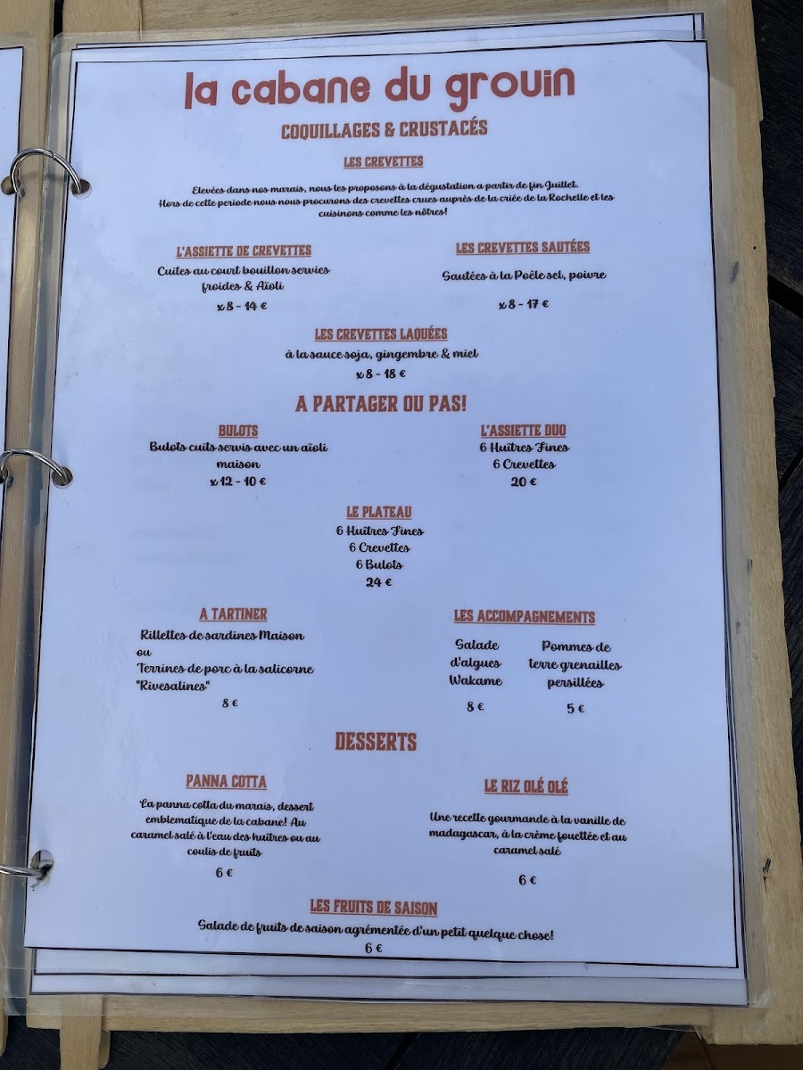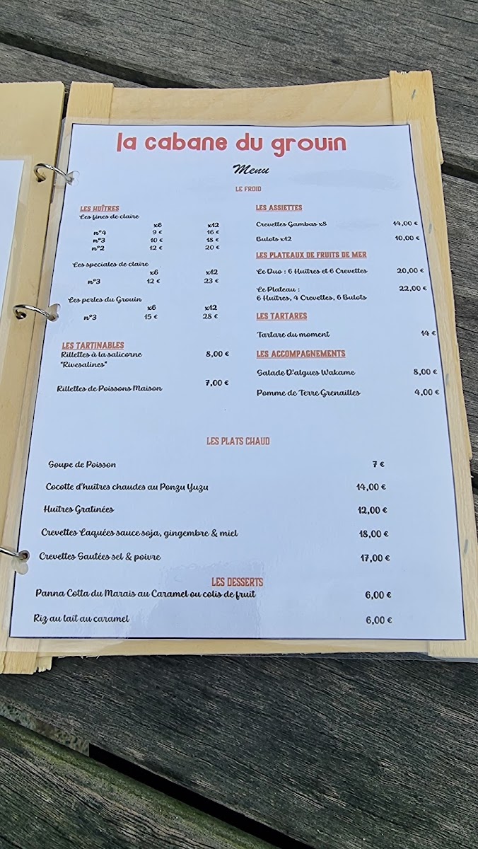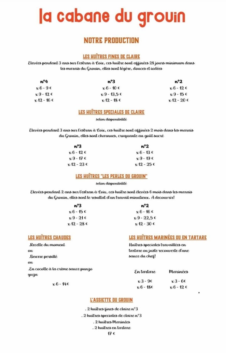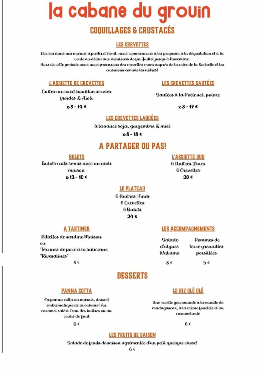 La Cabane Du Grouin offers a menu that is a celebration of the freshest seafood, perfectly reflecting its coastal location. The highlight is undoubtedly the 12 Huîtres Taille 2, a platter of plump, briny oysters that arrive with a simple accompaniment to let their natural flavor shine. Alongside these, the menu features a selection of other seafood delicacies, each thoughtfully prepared to emphasize freshness and quality. The dishes are straightforward yet elegant, focusing on the ingredients rather than overly complex preparations, which allows the natural flavors of the sea to take center stage. Whether enjoying a light appetizer or a heartier seafood main, the menu strikes a balance between indulgence and simplicity, offering diners an authentic taste of the region’s maritime bounty. With its careful attention to ingredient quality and seasonal offerings, La Cabane Du Grouin’s menu leaves a lasting impression, making it a must-visit for anyone seeking a genuine coastal dining experience.
